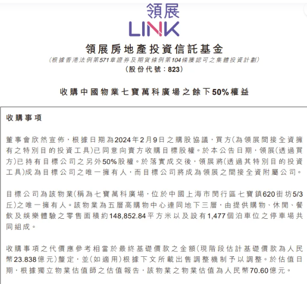 2月9日,亚洲最大房地产投资信托基金(REITs)领展房地产投资信托基金(领展)公告,通过其间接全资拥有的特别目的投资工具,与卖方签署购股协议,收购中国上海市闵行区七宝万科广场的余下50%权益,领展在2021年4月首次收购七宝万科广场五成权益,此次收购完成后将全资持有该项目。