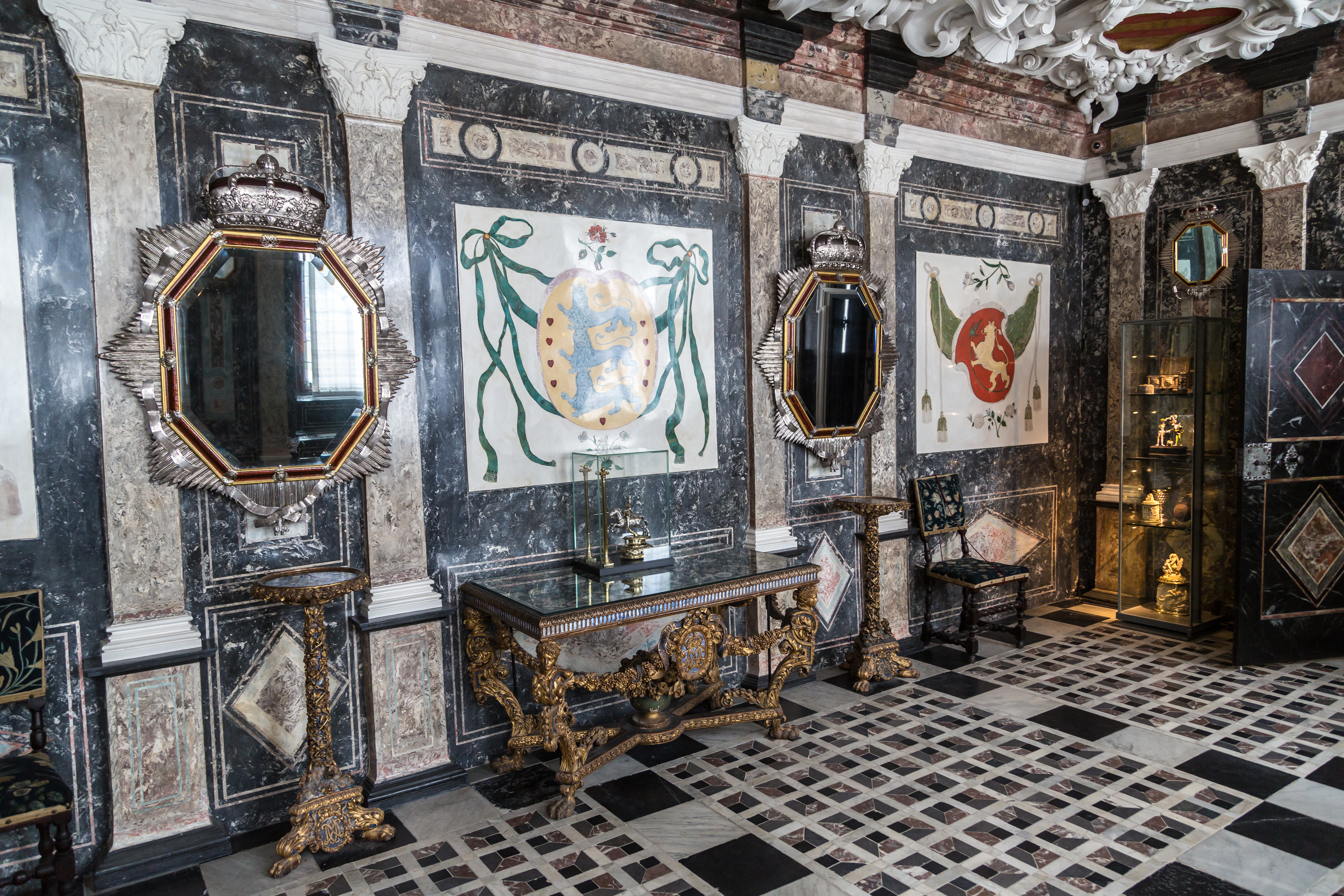 大理石厅原本是国王克里斯蒂安四世第二任妻子克斯汀‧蒙克(Kirsten Munk)的卧室,展现丹麦王室的权力和财富。1668年,国王腓特烈三世(King Frederik III)为颂扬君主制,以极尽华丽的巴洛克风格重新装修这间房间。天花板上的灰泥粉饰可见身材胖胖、带有翅膀的小天使(putti),展示象征王权的标志。小天使围起爱心造形的区块展示丹麦国徽的各个组成部分。墙上以仿大理石装饰,这在当时其实比真正的大理石昂贵,同样以各式徽章装饰。