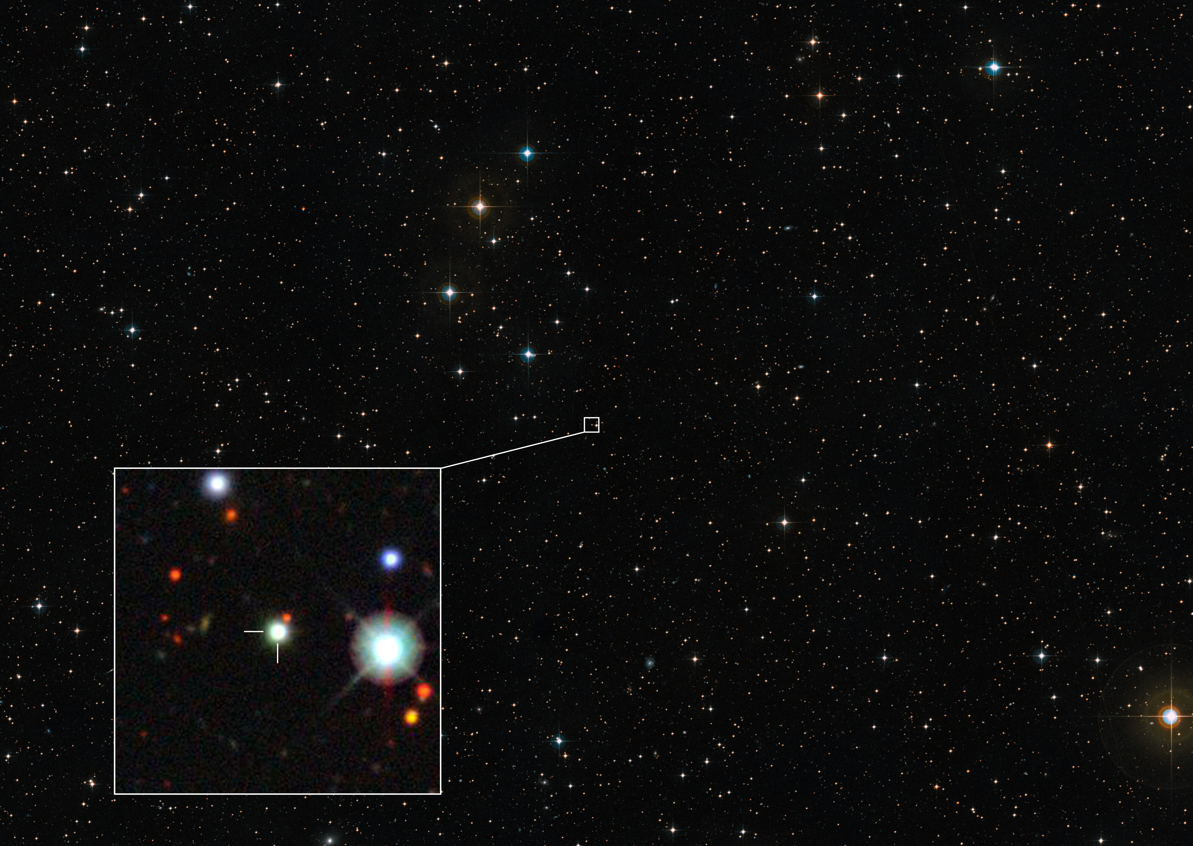 欧洲南方天文台(European Southern Observatory)在2月19日发布的新闻稿中指出,天文学家藉由该天文台的甚大望远镜(Very Large Telescope)观测到一个被命名为J0529-4351的类星体,它距离地球超过120亿光年。