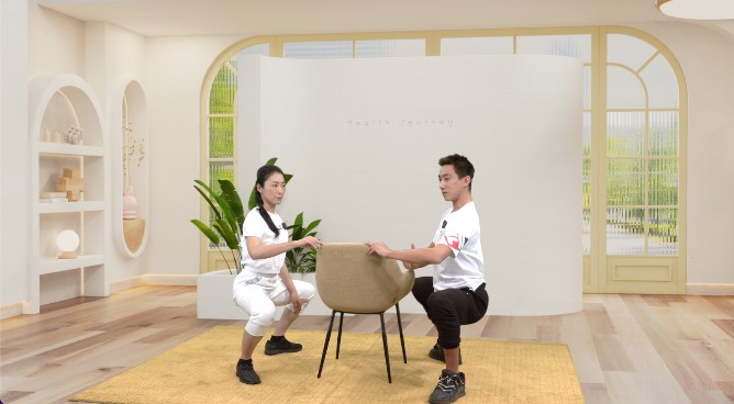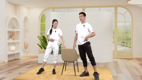 Step2:双手扶椅子(桌、墙),屁股往前推一点,重心微微偏前、缩小腹、肩膀下放。