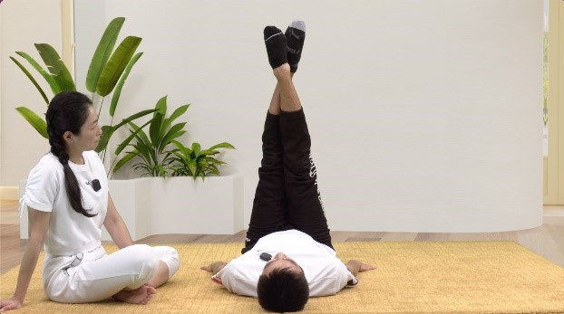 Step1:仰躺,脚向上伸直冲天,双脚脚踝交叉。维持这个姿势很考验腹肌及背部力量。