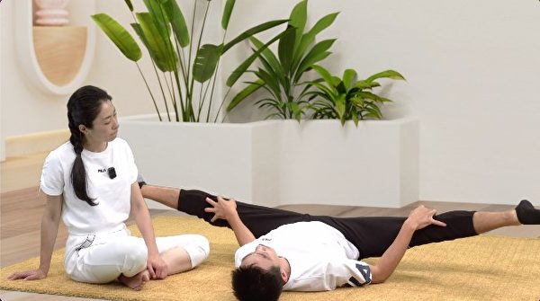 Step3:膝盖不要晃动,将小腿上抬延伸,伸直后可以用手帮忙将腿往身体方向拉。