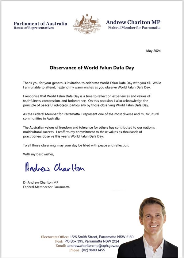 “澳洲自由和宽容他人的价值观造就了我们国家多元文化的成功。在成千上万的修炼者纪念今年的世界法轮大法日之际,我重申我对这些价值观的承诺。”贺信写道。