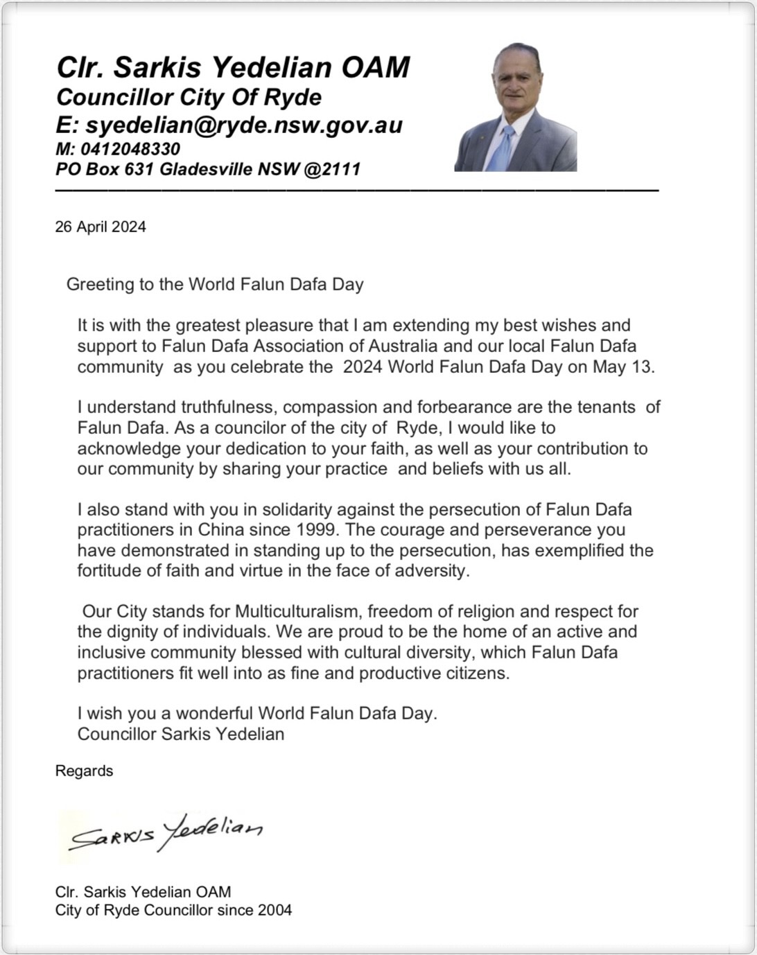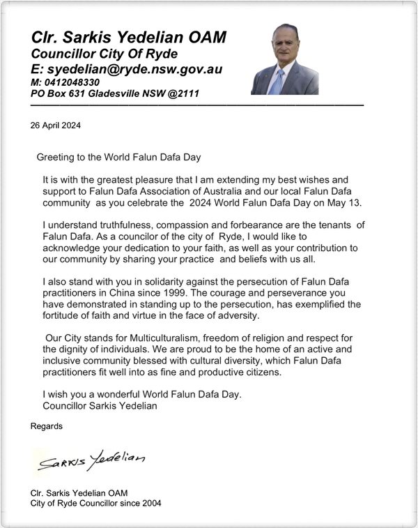 华人重镇Ryde市政府前市长、现任市议员萨基斯·耶德良(Sarkis Yedelian)在贺信中说,“在5月13日庆祝2024年世界法轮大法日之际,我非常高兴地向澳洲法轮大法协会和当地的法轮大法团体致以最良好的祝愿和支持。”