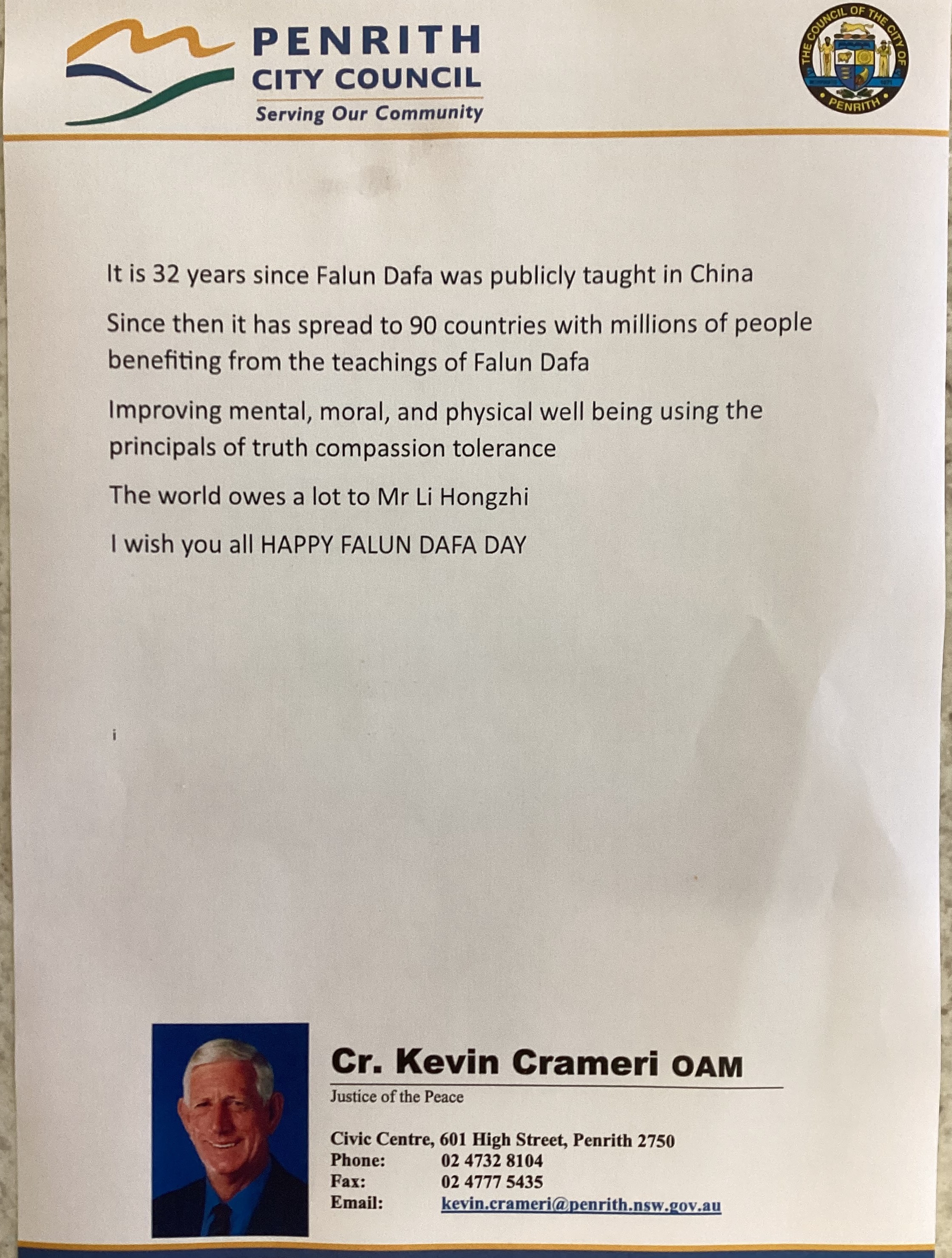悉尼Penrith市议员凯文·克拉梅里(Cr Kevin Crameri)在贺信中说,法轮大法自从在中国公开传授至今已有32年,数千万人受益于法轮大法的教义——用 “真、善、忍”的原则提升精神、道德和身体健康。