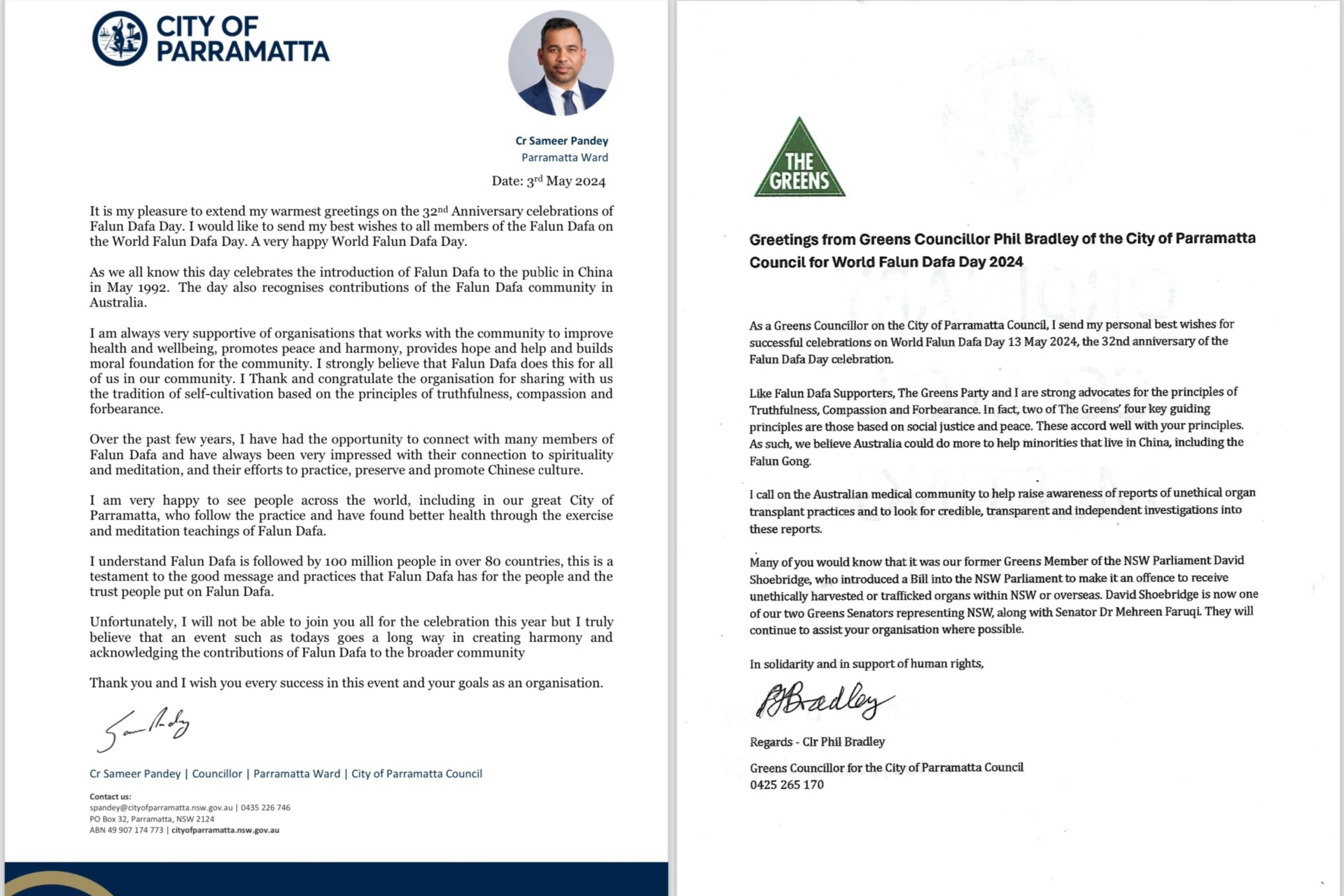 Parramatta市另一位市议员菲尔·布拉德利(Cr Phil Bradley)也致贺信,在祝愿法轮大法日庆祝活动圆满成功的同时,他呼吁澳洲医学界关注不道德器官移植。