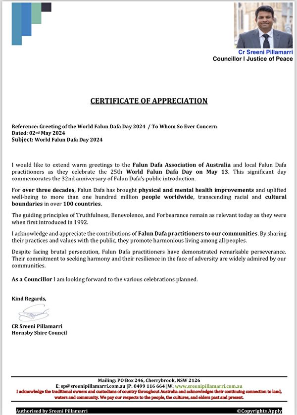 悉尼北区华人重镇Hornsby市市议员斯雷尼·皮拉马里(Sreeni Pillamarri)在贺信中表示,法轮功面对逆境表现出的坚韧令社会各界钦佩。