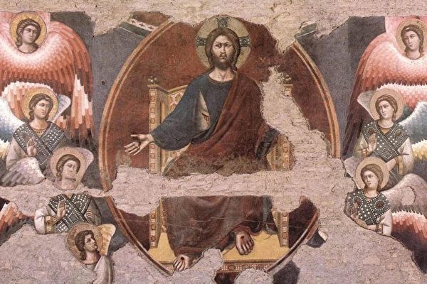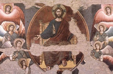 在卡瓦利尼的壁画中央是传统上对“审判中的基督”(拉丁文“Maiestas Domini”(庄严基督)的变化形,这种基督教艺术最早可追溯至四世纪)。卡瓦利尼将耶稣安排在杏仁状的神圣光环(mandorla,意大利语为杏仁之意)中,象征着他的神威和超然事迹。我们可以看到他的侧边、手上和脚上都有伤口,表示着他在殉难和十字架上所受之苦。他的头顶环绕着金色的十字形光环,再次提醒我们他的神圣与无私的牺牲。