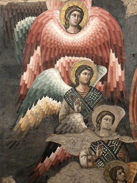 人们必须进到修女的唱诗班来能欣赏整幅壁画的场景,因为教堂的长椅遮住了在基督下方的人物。在那里,我们可以看到成群结队的人们走向天堂之门,天使演奏着凯旋的音乐,迎接他们的到来。非常可惜这个角度的场景很难用相机捕捉。