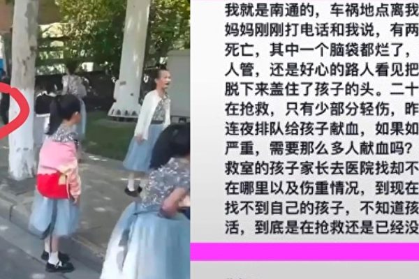 【大纪元2024年05月15日讯】近日江苏南通市发生满载学生的大巴车与渣土车相撞事故,据当地政府通告,大巴车上载有45人,除司机外还有39名学生,3名教师和2名家长,撞击后大巴车右侧损毁严重,车上学生死伤惨重。事故原因是大巴车行驶方向的红绿灯坏了一直没有进行维修,网上流传的视频中显示事发时大巴车直行方向的红绿灯全部是黑的。