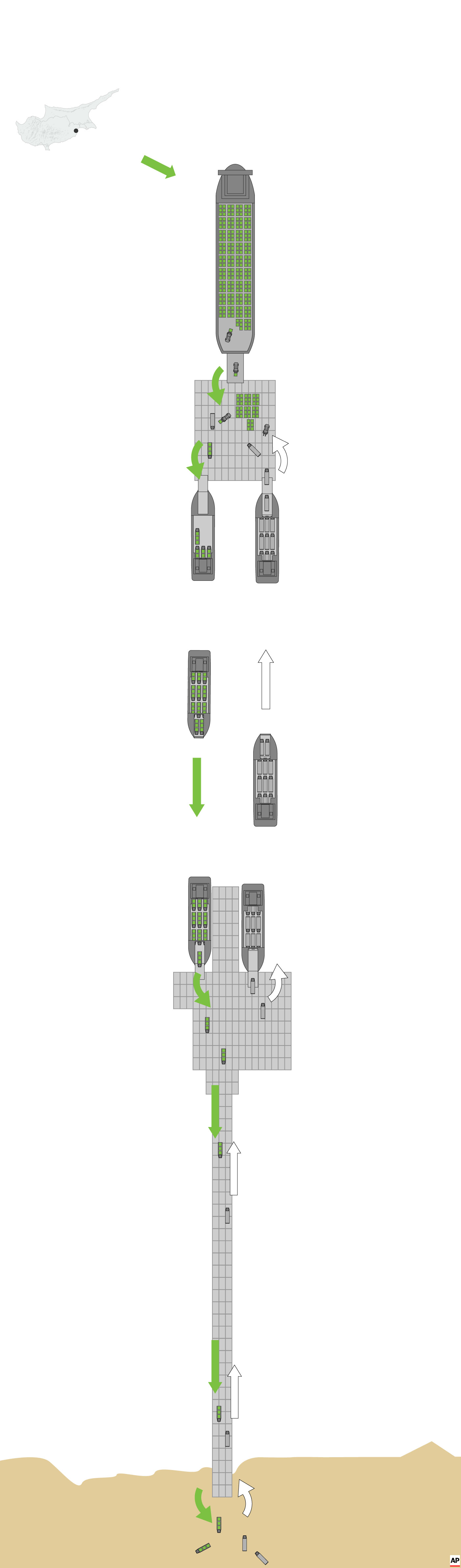 根据新的海上路线,人道主义援助物资首先运往塞浦路斯的拉纳卡港。然后装载到船上,行驶约200英里(320公里)到美军方在加沙海岸建造的大型离岸浮动平台。