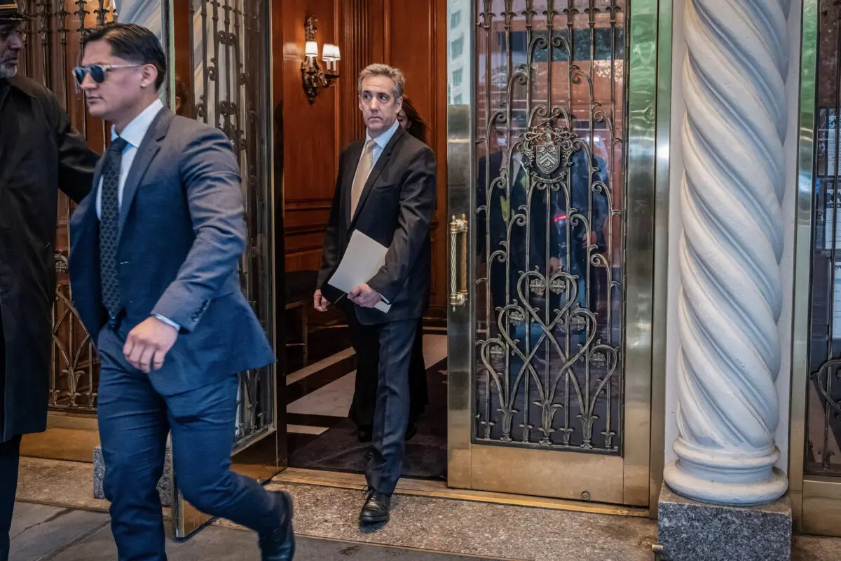 2024年5月16日,前总统川普的前私人律师迈克尔·科恩正离开他的公寓楼,前往纽约市法院。(Spencer Platt/Getty Images)