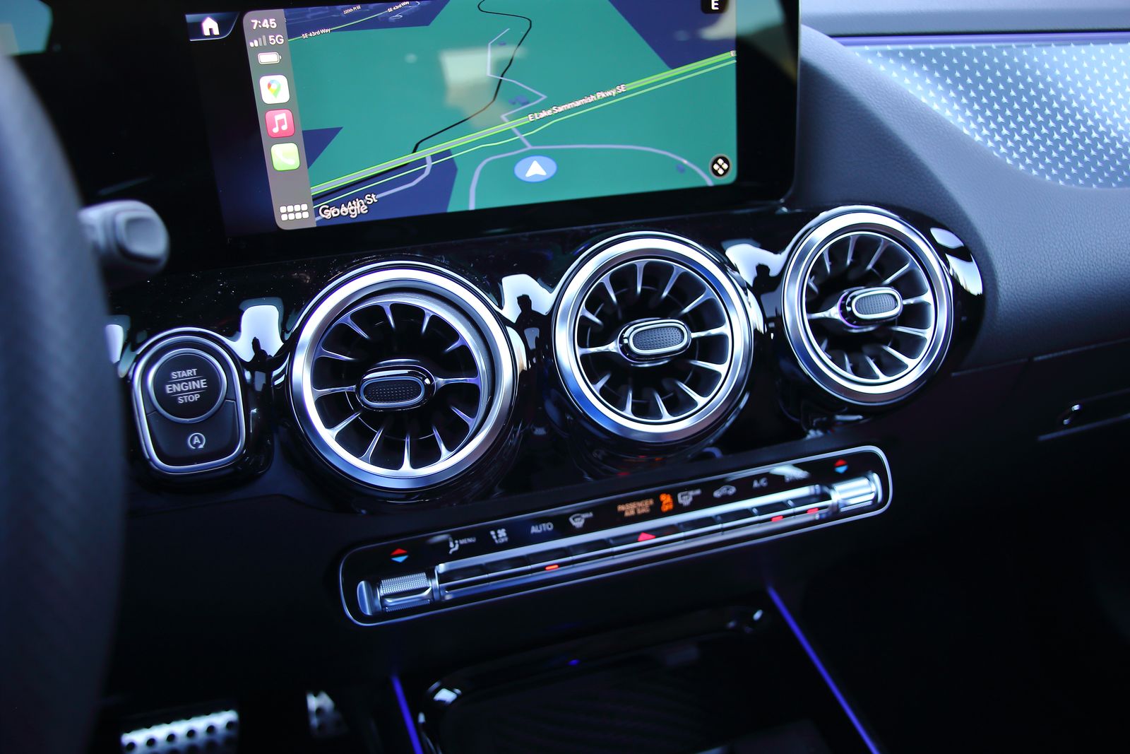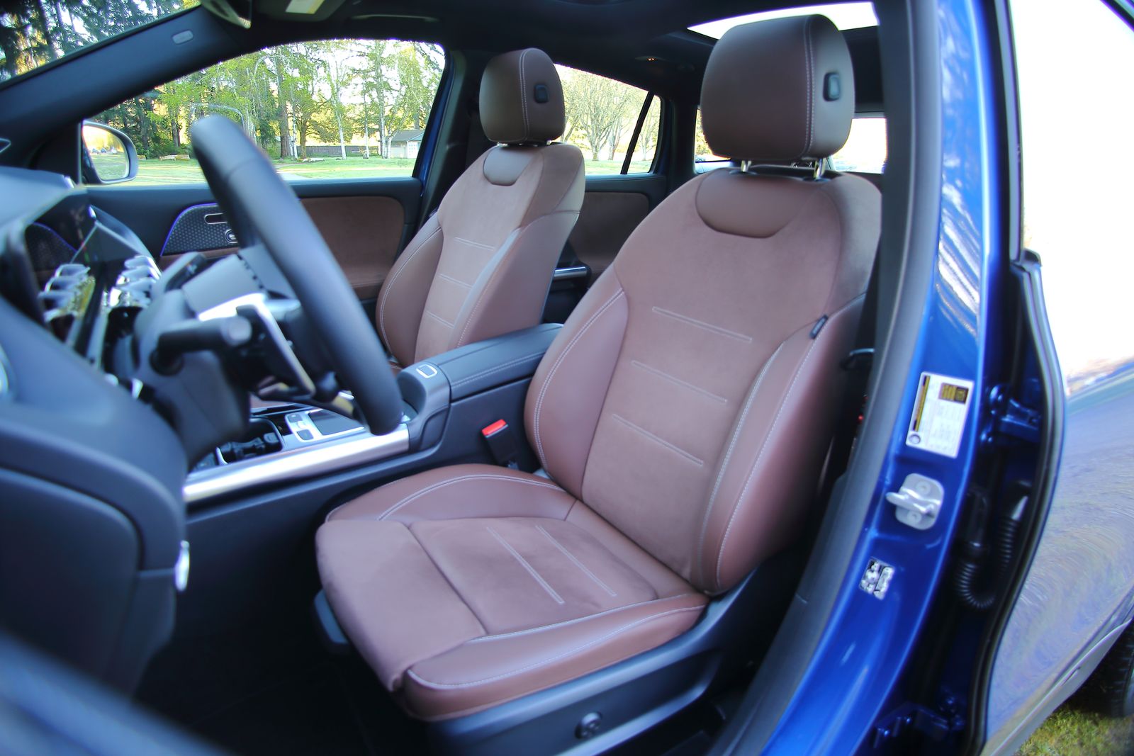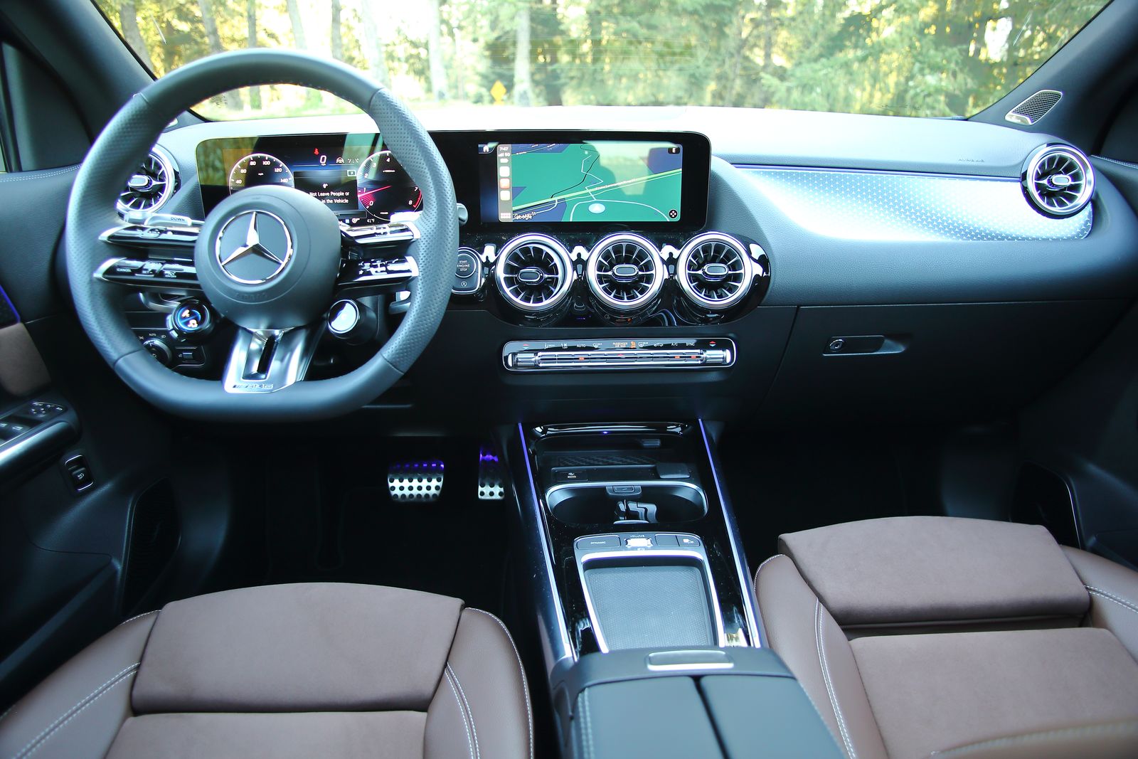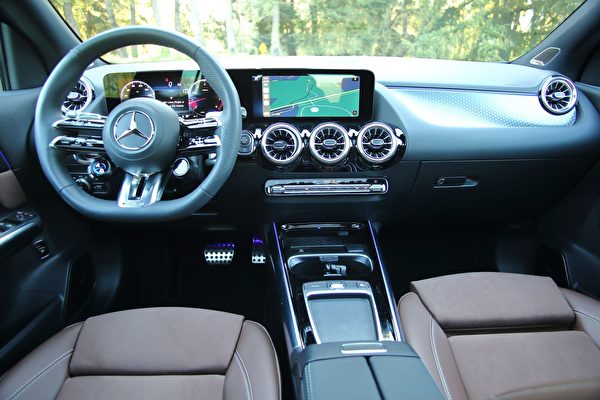 在车内,棕色的人造皮革座椅及车门内侧装饰,座椅旁边皮革是光滑材质,而中间是像麂皮的质料,增加乘坐磨擦力。GLA 35配备AMG独有的双条三幅式方向盘,方向盘上有各种功能按键,后方也装有Paddle Shift金属拨片,而在方向盘下方,左右各有一个圆形附显示的旋扭/按键,右方旋扭用作选择AMG Dynamic Select驾驶模式,包括Comfort(舒适)、Sport(运动)、Sport+(运动+)、Individual(个性化)及雪地(Snow)。左方圆键萤幕分为上下两部分,用作调节不同设定,例如悬挂系统。