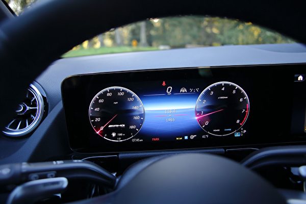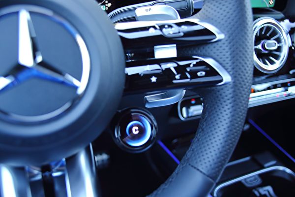 10.25吋的仪表版萤幕有三种AMG显示风格:经典、运动和超级运动。仪表板是与中控台萤幕“连成一片”,中控台萤幕尺寸也是10.25吋,内置MBUX资讯娱乐系统,除了一般Mercedes-Benz车系功能之外,还包括各种AMG特定的显示器和功能,例如AMG Dynamic Select快速选择,整合了用于赛道的数据记录器AMG Track Pace。AMG Track Pace用于具体分析和改进驾驶技能。这是由卫星定位系统和数据(如横向和纵向加速度、油门和刹车踏板位置或转向角)协助的。所有值都清晰地显示出来,可以直接在车辆上读取。
