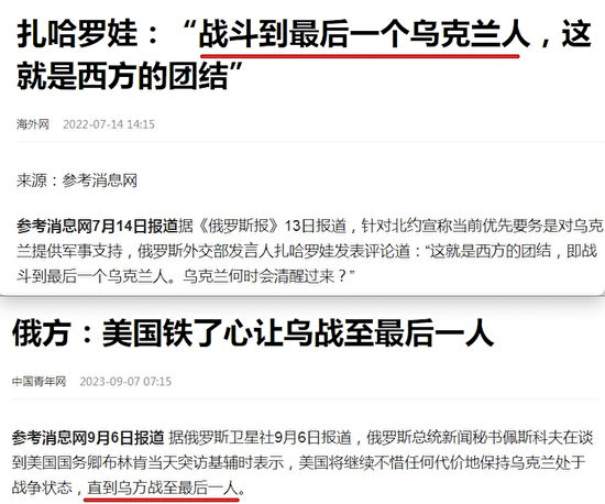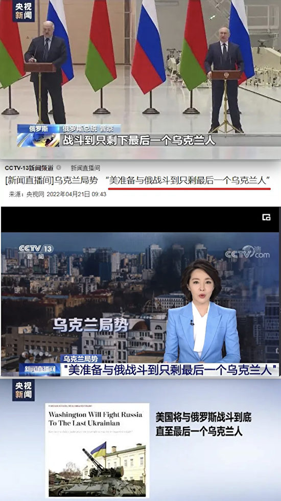 大纪元记者注意到,“战斗到最后一个乌克兰人”——这句话追根溯源是出自俄罗斯官方之口,又经中共央视、《参考消息》等官媒的广泛报导,而在中国互联网上广泛传播,甚至一些中共体系内的知名学者也经常引用这句话来褒俄贬乌。