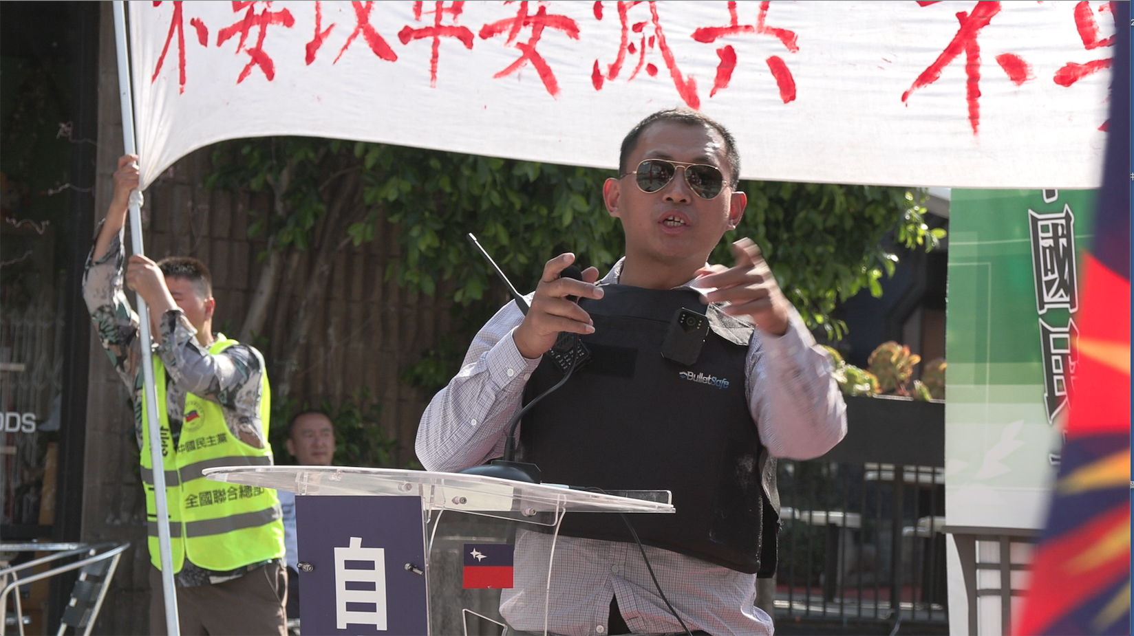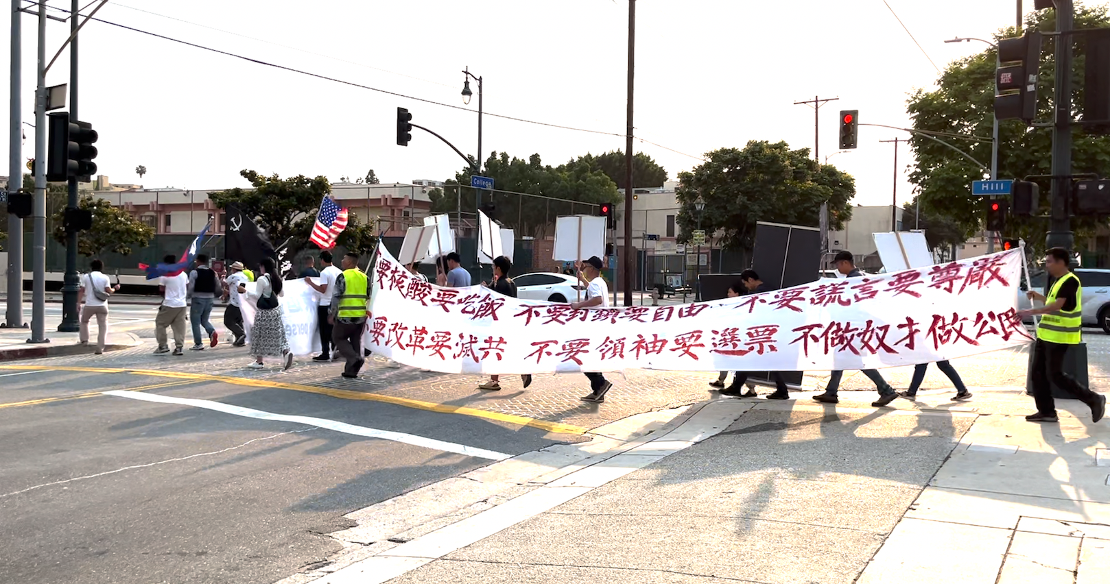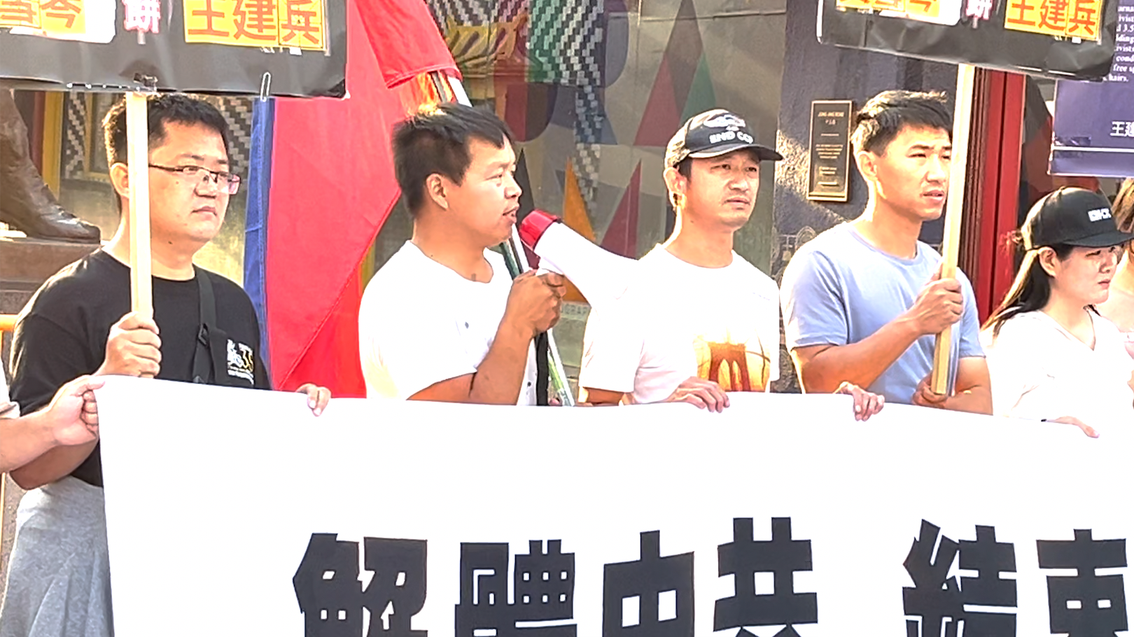 “我们也希望,中国城街周边的一些亲共组织不要再升五星红旗。在自由世界,这是一种污染,是对自由民主的污染。”界立建说,应该丢弃五星红旗,“它是肮脏邪恶的东西,它代表中共想永远奴役中国老百姓。那个红色代表中共的革命。革谁的命?革老百姓的命,革知识分子的命,革工商业主的命。这是一面血旗,上面聚集了无数的冤魂”。