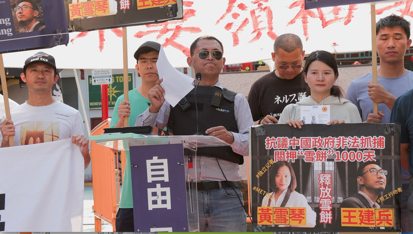 集会者之后到唐人街游行,众人高举“释放雪饼(黄雪琴与王建兵)”“解体中共 结束迫害”的横幅,喊着“打倒共产党”“释放维权人士”“反对政治迫害”等口号,引来居民和商家围观。一位老阿姨给他们递过几瓶水说:“我支持你们!”