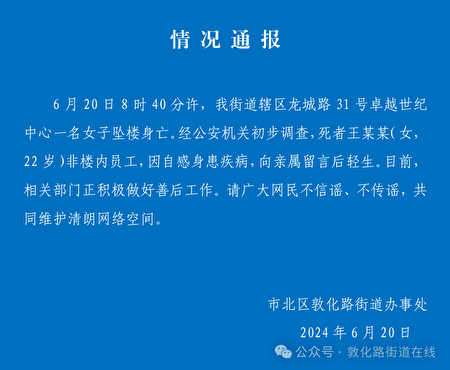 【大纪元2024年06月20日讯】(大纪元记者骆亚采访报导)6月20日上午青岛卓越世纪中心一名女子跳楼,随后罕见由当地街道办事处发情况通报,而不是公安部门。通报称死者因健康原因自杀,非楼内员工。自杀原因与民间网传不符,目前尚未有定论。