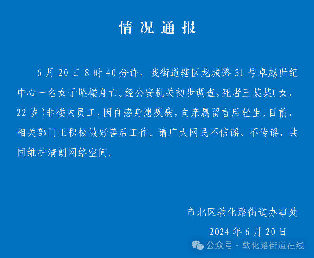 20日上午,青岛卓越世纪中心1号楼有一名女子跳楼。当天下午非公安机关的辖区市北区敦化路街道办发了一则情况通报,公布自杀时间为早晨8点40分,死者王XX,年仅22岁,非楼内员工。