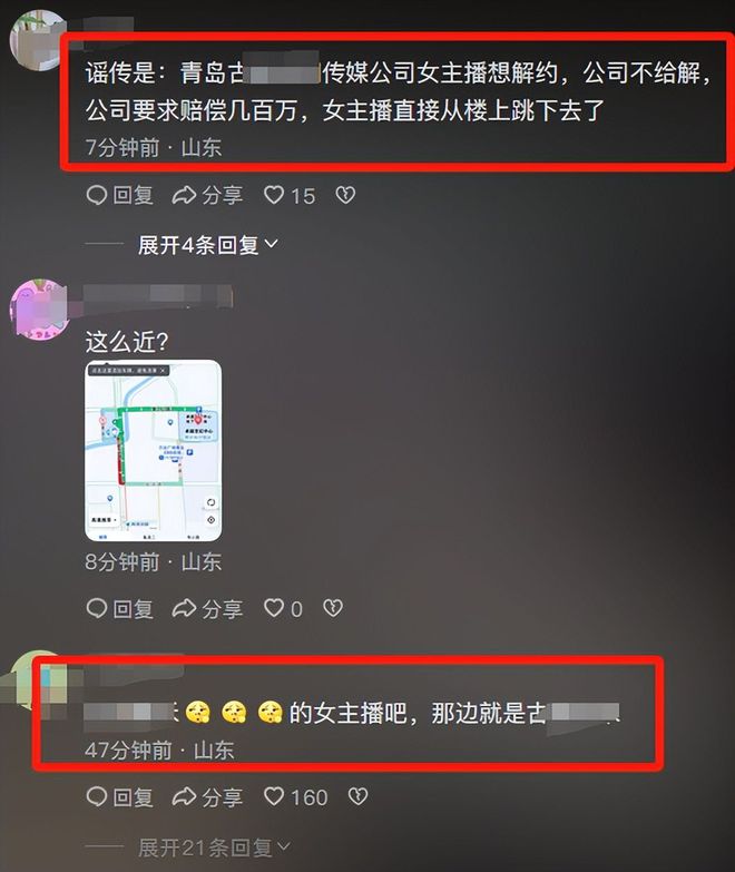网传该女子是从这座大楼的58层一跃而下,结束了自己年轻的生命。原因是该女子是青岛某传媒公司的女主播想解约,公司不给解,公司要该主播赔偿几百万,女主播直接从楼上跳下去了。