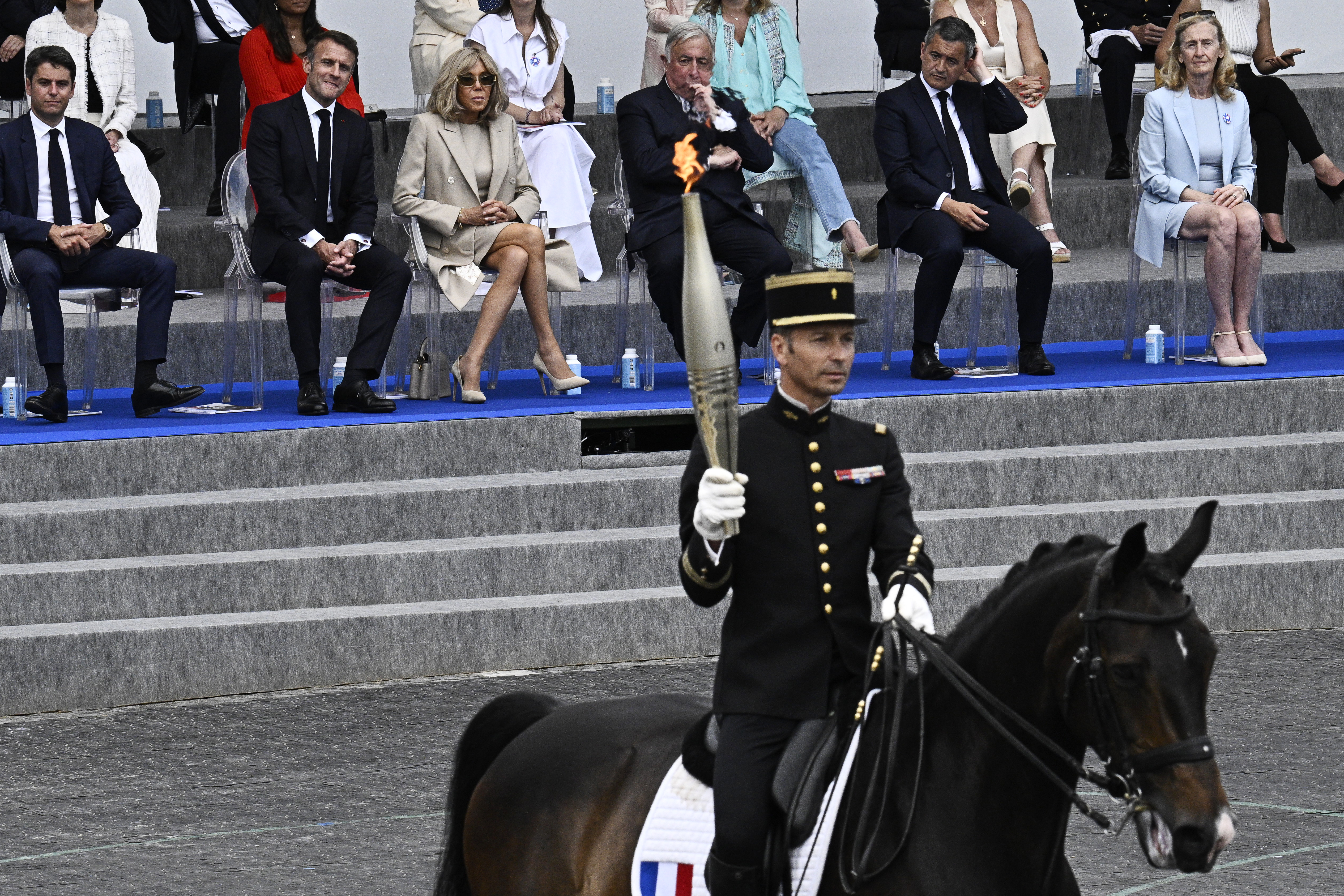 在国庆大游行尾声,索穆尔黑框骑术学校的首席骑师、里约奥运马术三项全能金牌得主蒂博-瓦莱特(Thibault Vallette)上校将火炬交给了来自塞纳-圣但尼省24位青年的其中一位,开启了一场集体的火炬接力。