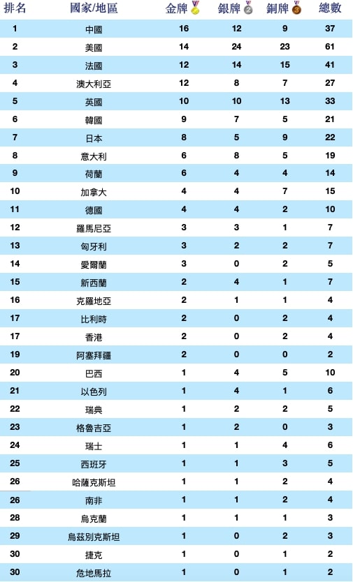 以下是8月4日北美时间5点10分更新的巴黎奥运奖牌榜: