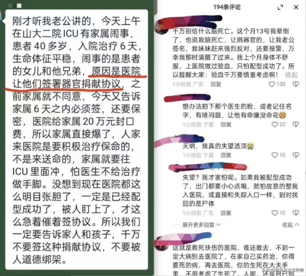 还有网民曾爆料,山东大学第二医院的一位患者,入院治疗6天,生命体征平稳,院方却要求患者家属签署器官捐献协议,家属不同意,事态扩大,医院给家属20万“封口费”,结果矛盾激化。
