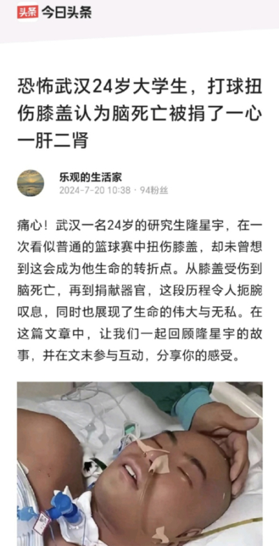 隆星宇因膝盖扭伤丢命,还捐器官的消息引发舆论关注。有网民说,一旦器官配型成功,就算是一点点摔伤,到了医院都可能“脑死亡”。