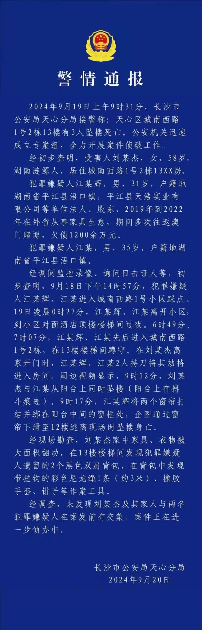 9月19日,长沙市公安局天心分局发布警情通报称,19日上午9时12分,长沙市天心区城南路一小区宿舍内发生一起刑事案件。刘某杰(女,58岁)遇害,犯罪嫌疑人江某(男35岁)、江某辉(男,31岁)坠楼身亡。目前,案件正在进一步侦办中。
