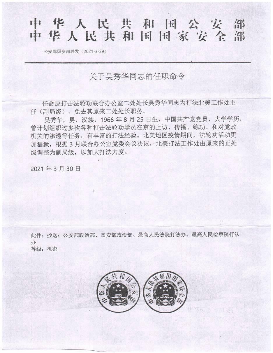 公开报导显示,中共对海外法轮功的镇压正在升级。2021年6月29日,“追查国际”组织发布关于中共公安部和国安部新任命“北美打击法轮功工作处”主任吴秀华的调查报告,报告披露了中共在美国迫害法轮功的实体行政执行机构——北美打击法轮功工作处,该机构是由中共公安部和国安部联合成立,2021年由处级建制升为副局级。