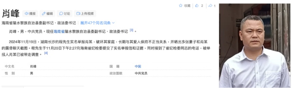 据海报新闻报导,程先生于11月20日下午向海南省纪检委提交了实名举报信和证据,同时接到了省纪检委人员的电话,被举报人肖峰已被带走调查。