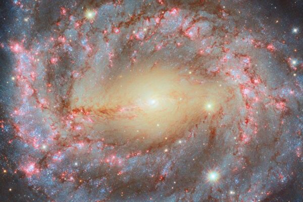 尽管尘埃具有遮蔽性,但一些活跃的恒星形成区域在黑暗云气后面闪闪发光。我们还可以看到该星系的中心有一个发光的、几乎是蛋形的“凸起”。所有螺旋星系都有一个与此类似的“凸起”,这是它们的结构之一。
