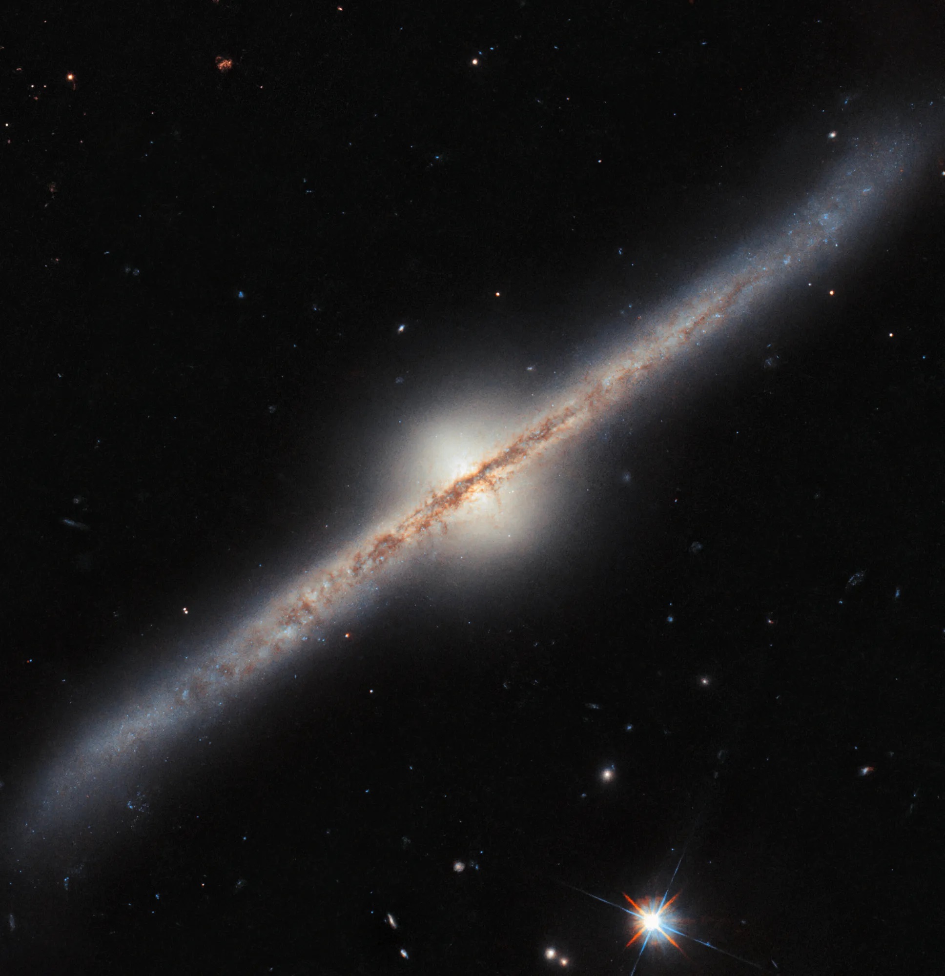这种侧边视角使UGC 10043的星系盘看起来像一条穿过太空的尖锐线条,其突出的尘埃带形成厚厚的云带,使我们看不到该星系发出的光。如果我们能够飞到UGC 10043上方,从上往下观察它,我们会看到这些尘埃散布在该星系上,可能勾勒出它的旋臂。