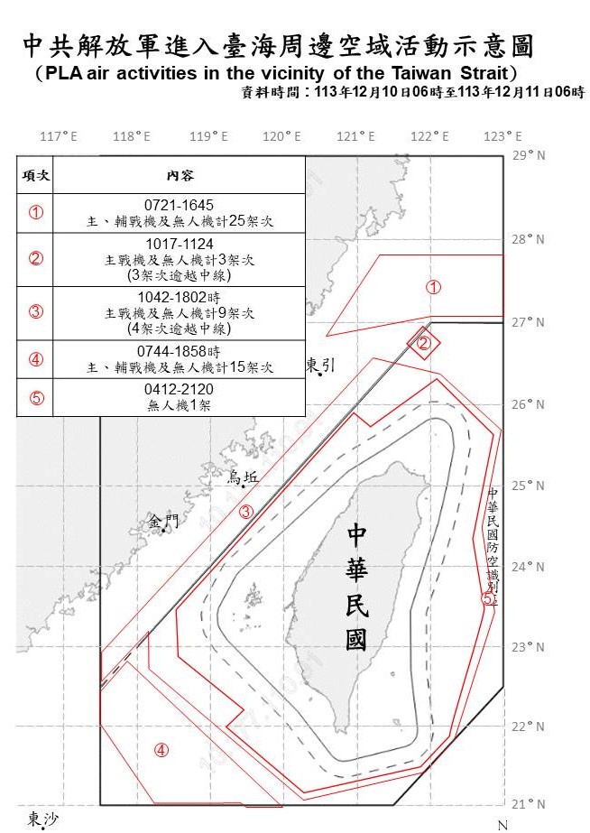 12月10日6时至12月11日6时,台湾军方通报,侦获中共军机53架次,其中台湾北部空域28架次,西南空域15架次,台湾海峡9架次,台湾东部1架次。