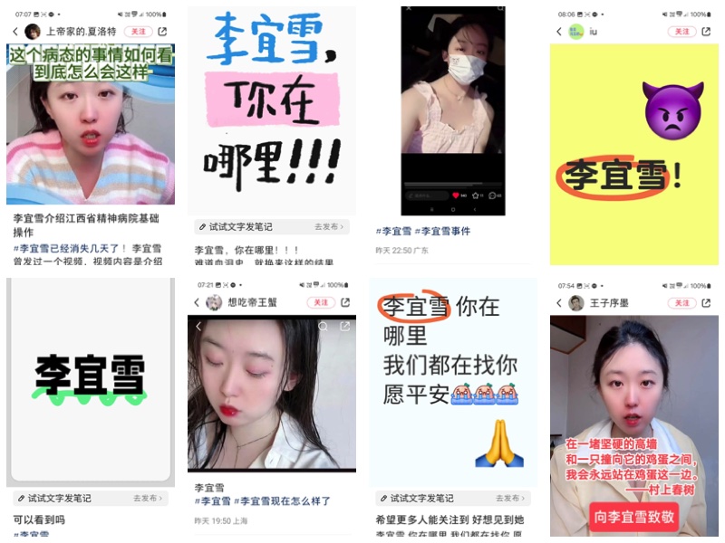 大纪元记者核实发现,社交媒体平台搜索功能中,以李宜雪为标签的各种内容,比如“李宜雪事件”“李宜雪失踪”“李宜雪现状”,搜索结果显示前6至8条是李宜雪相关内容,随后出现的多是不相关的内容。