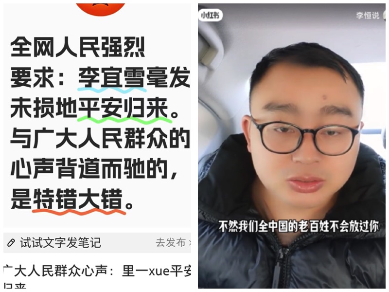 这次声援李宜雪时,网友理直气壮用全网人民、全中国百姓的名号发声。其中12月21日有网友发笔记,“全网人民强烈要求:李宜雪毫发未损地平安归来。与广大人民群众的心声背道而驰的,是特错大错。”