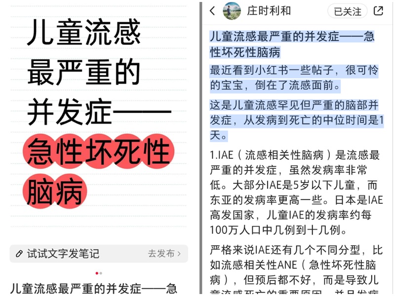 广东的一名医生博主“庄时利和”,她是南方医科大学临床医学学士、北海道大学神经科学硕士。1月8日她撰文提醒,儿童流感最严重并发症出现——急性坏死性脑病。她说,最近看到小红书一些帖子,很可怜的宝宝,倒在了流感面前。“这是儿童流感罕见但严重的脑部并发症,从发病到死亡的中位时间是1 天。”