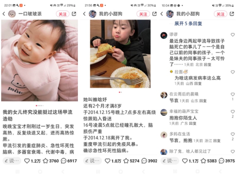 据中共疾控中心公布的流感监测报告称,流感病毒多为甲流H1N1,但并提供重症及死亡的具体信息。而三周不到,大陆小红书上,据不完全统计,民间披露的因流感导致脑炎死亡不下十起。