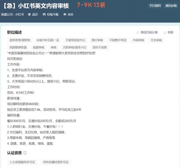网传图片显示,小红书近日宣布紧急招聘英文内容审核员,以进一步壮大其内容审核团队,英文内容审核员地点设在武汉。