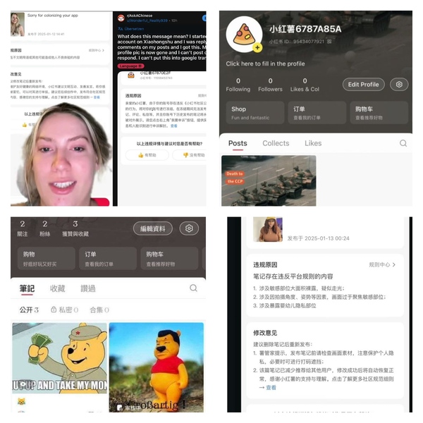 “一堆美国TikTok用户跑到小红书‘庇护’,让小老外好好体验一下什么叫‘中共版言论自由’。”“小红书是所有社交应用中审查体系最严格的。为了展示自己的‘叛逆’蔑视美国政府而涌入小红书的,在被铁拳砸醒之前,好好体验一下当赛博拆腻子(注:赛博,即Cyber,是指电脑和网络;拆腻子,是Chinese——即中国人的谐音)的生活吧。”“放心,小红书热不了多久的。”