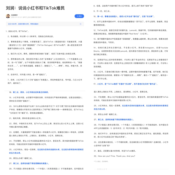 第一,要看这些美国人,是把小红书当成“替代品”,还是“抗议牌”。小红书不是他们社交的“替代品”,他们真正的社交替代品是Instagram、YouTube Shorts,Lemon8。因为那些软件上面,才有他们真正的朋友。