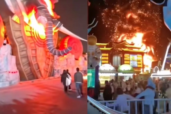 网传视频显示,一群民众正在现场观赏表演,夜景装饰墙突然起火,火舌蹿起两米多高。开始大家还以为是节目表演特效,但随后发现火势越来越大,竟然燃起了熊熊大火,现场瞬间大乱,民众惊慌逃离,尖叫、呼喊声不断。网民表示,“还好人群不算特别拥挤,不然后果不堪设想。”