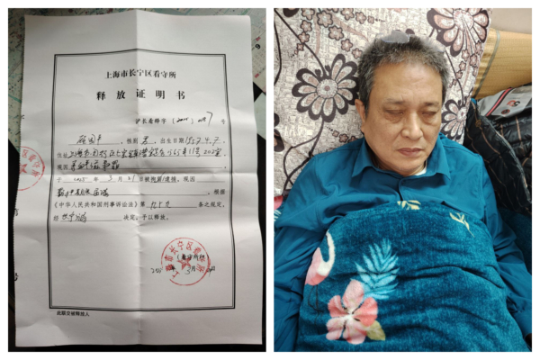 稍后,顾国平要求再测一次,血压又上升到212mmHg,警察却隐瞒这一次数据,强行将他送进看守所。21日晚上,他被5名警察抬进看守所,从凳子上摔下,因此伤了腰,在牢房里躺了三天,于3月24日被释放,但警方未给他开具拘留证明。