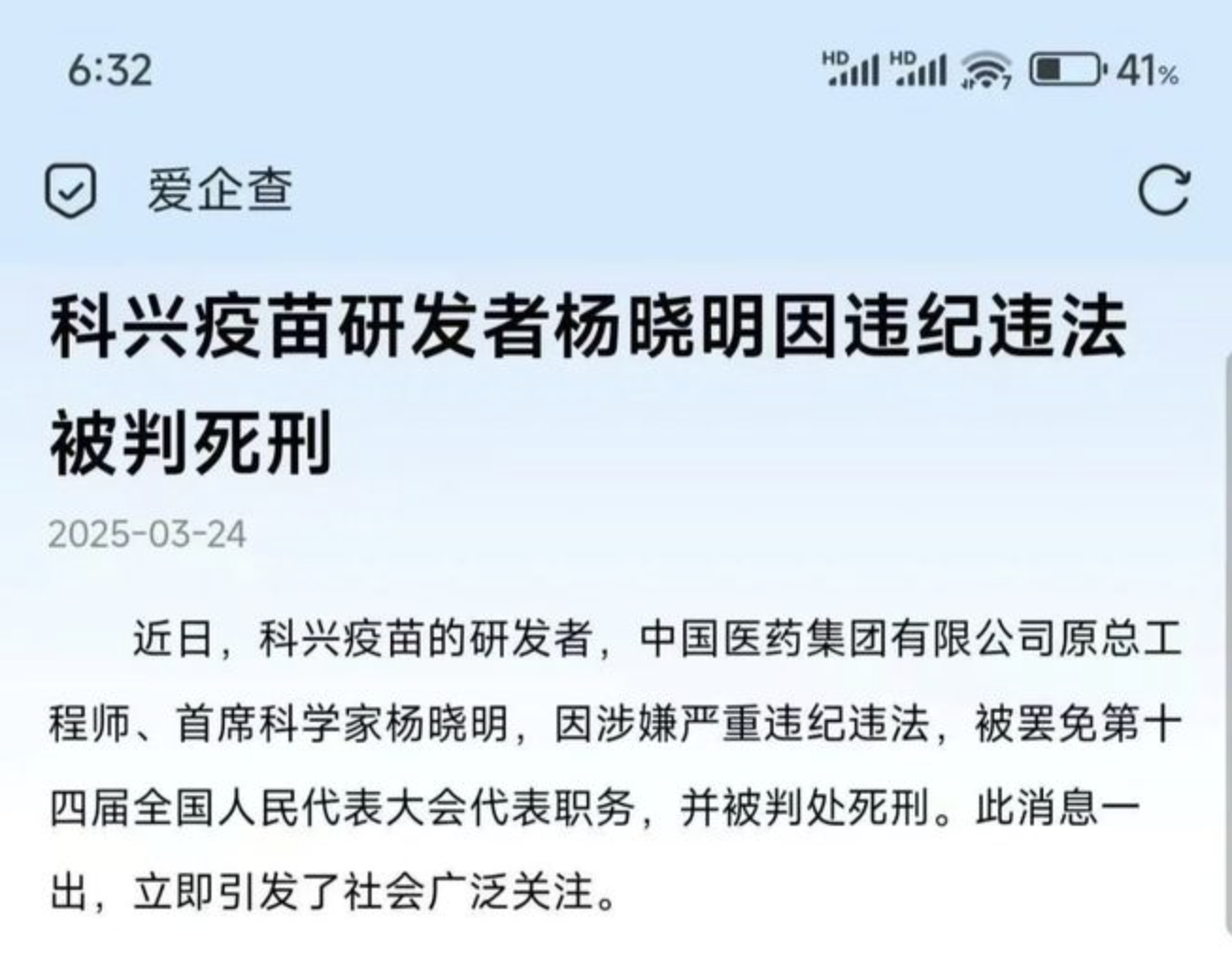 杨晓明被判处死刑的消息来源于百度网站的企业信用查询工具“爱企查”的一张截图。截图显示,爱企查24日以“科兴疫苗研发者杨晓明违纪违法被判死刑”为题报导称:“近日,杨晓明因涉嫌严重违纪违法,被罢免第十四届全国人民代表大会代表职务,并被判处死刑。他的违纪违法行为具体细节尚未公开,但已确认与疫苗研发或经营无关。”