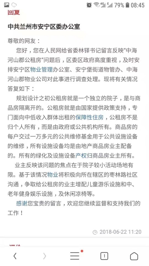 根据兰州市安宁区委办公室的一份公开答复,该小区在规划设计之初公租房就是一个独立的院子,是与商品房隔开的。所有绿化及设施设备产权归商品房业主所有。当地政府承诺争取给公租房增配儿童游乐设施和中、老年健身娱乐设施,及休闲凉椅等。