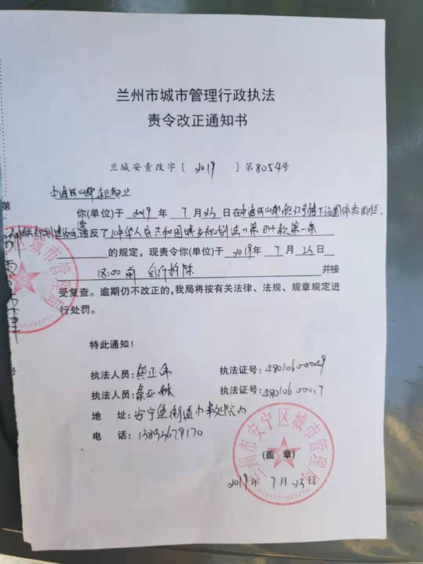 接着,安宁区城管局发出一份责令改正通知书,要求物业整改隔离围栏。