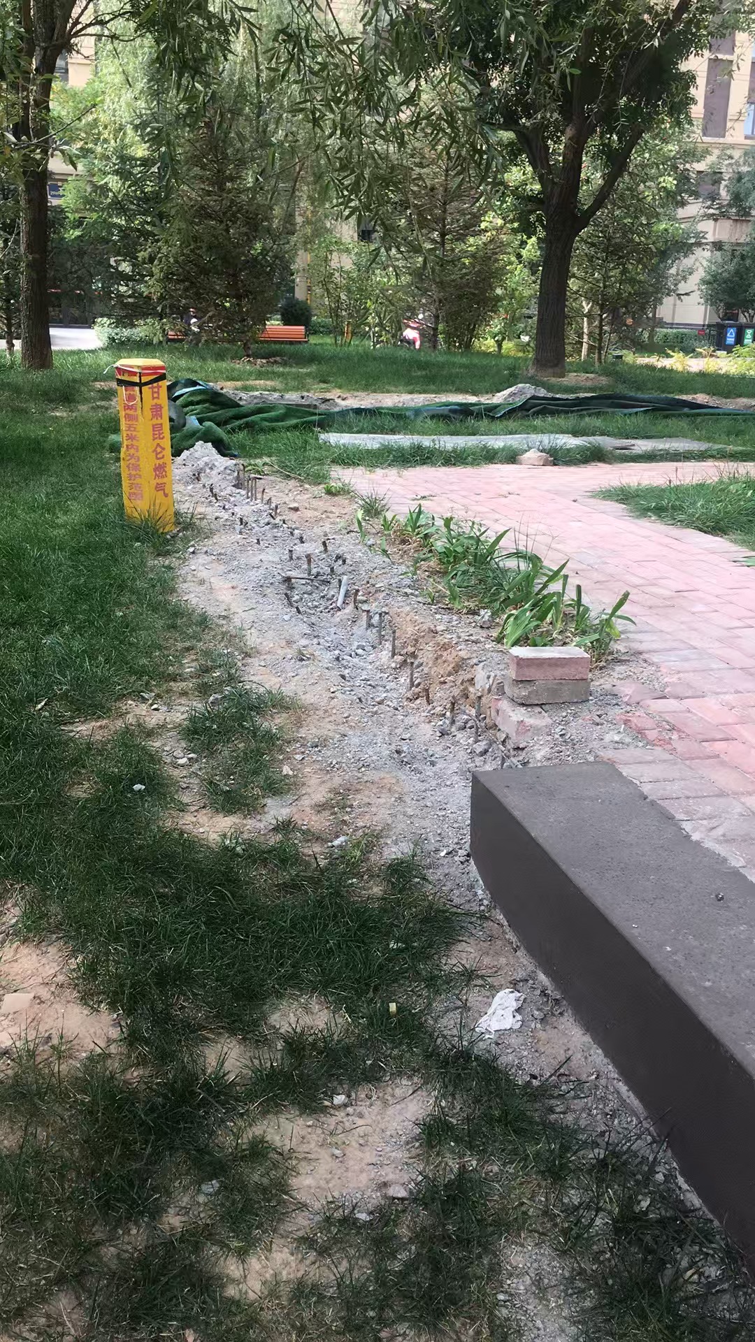 由于在建筑的时候,两个院子打的地基都是分开的,拆掉上面的栅栏后,城管却拆不掉底下的桩子,物业就用水泥把它砌上,后来用塑料草坪盖住。就这样,强行把两个院子打通了。
