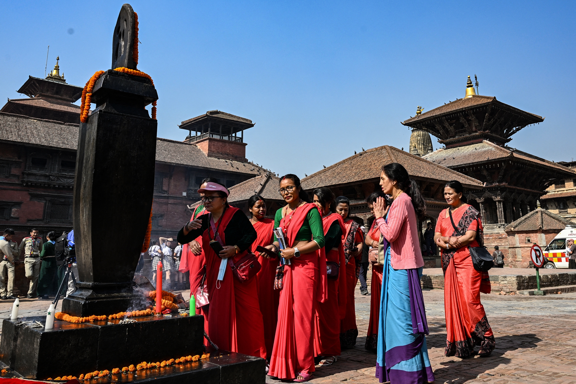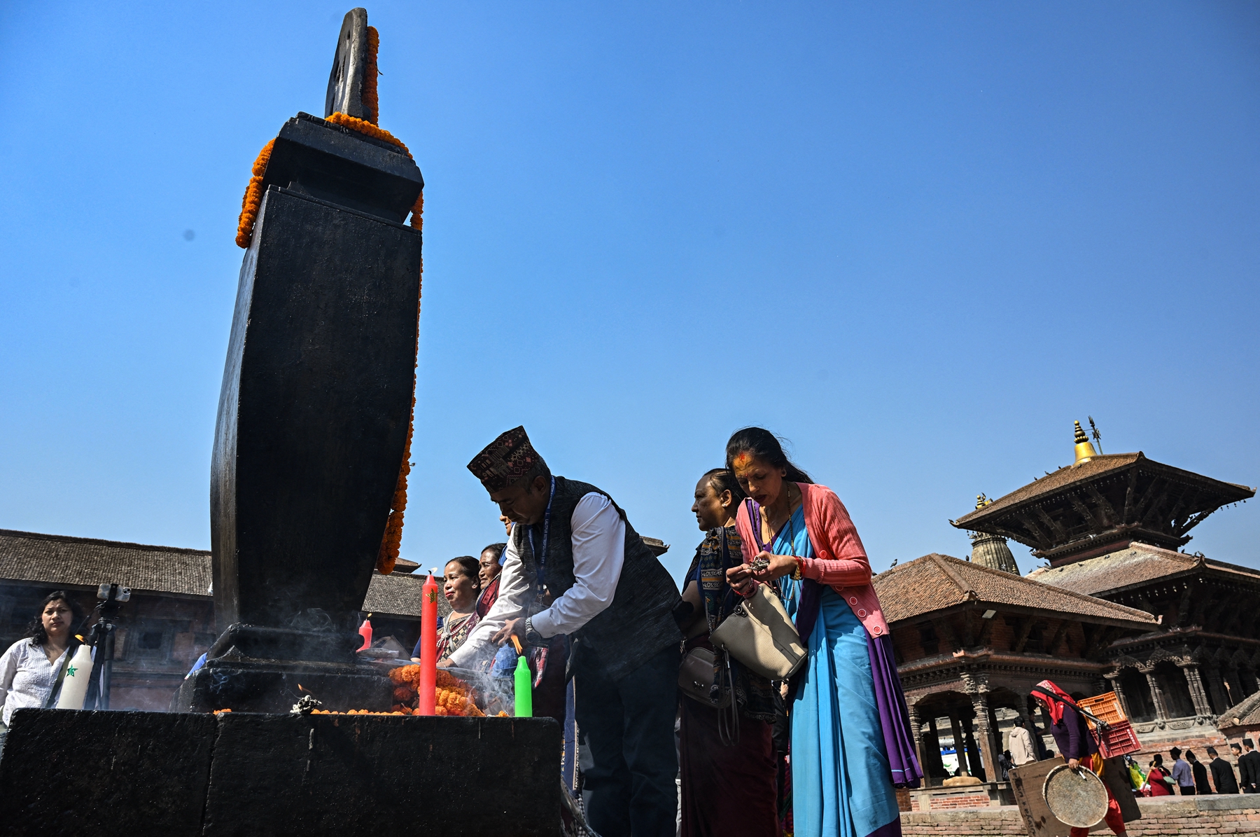 2025年4月25日,即尼泊尔“4.25”大地震十周年之际,民众聚集在加德满都附近的帕坦杜巴广场(Patan Durbar Square),向当年的地震遇难者致敬。(Prakash Mathema/AFP via Getty Images)
