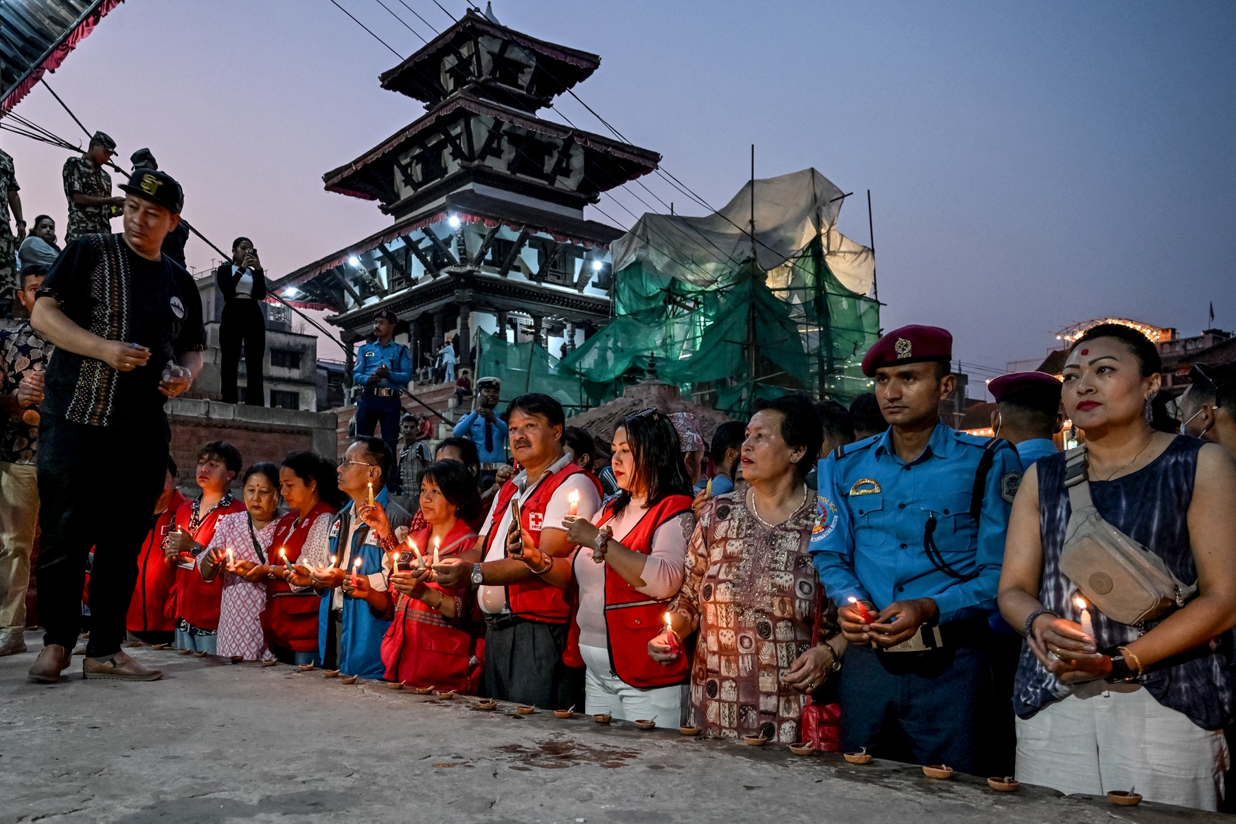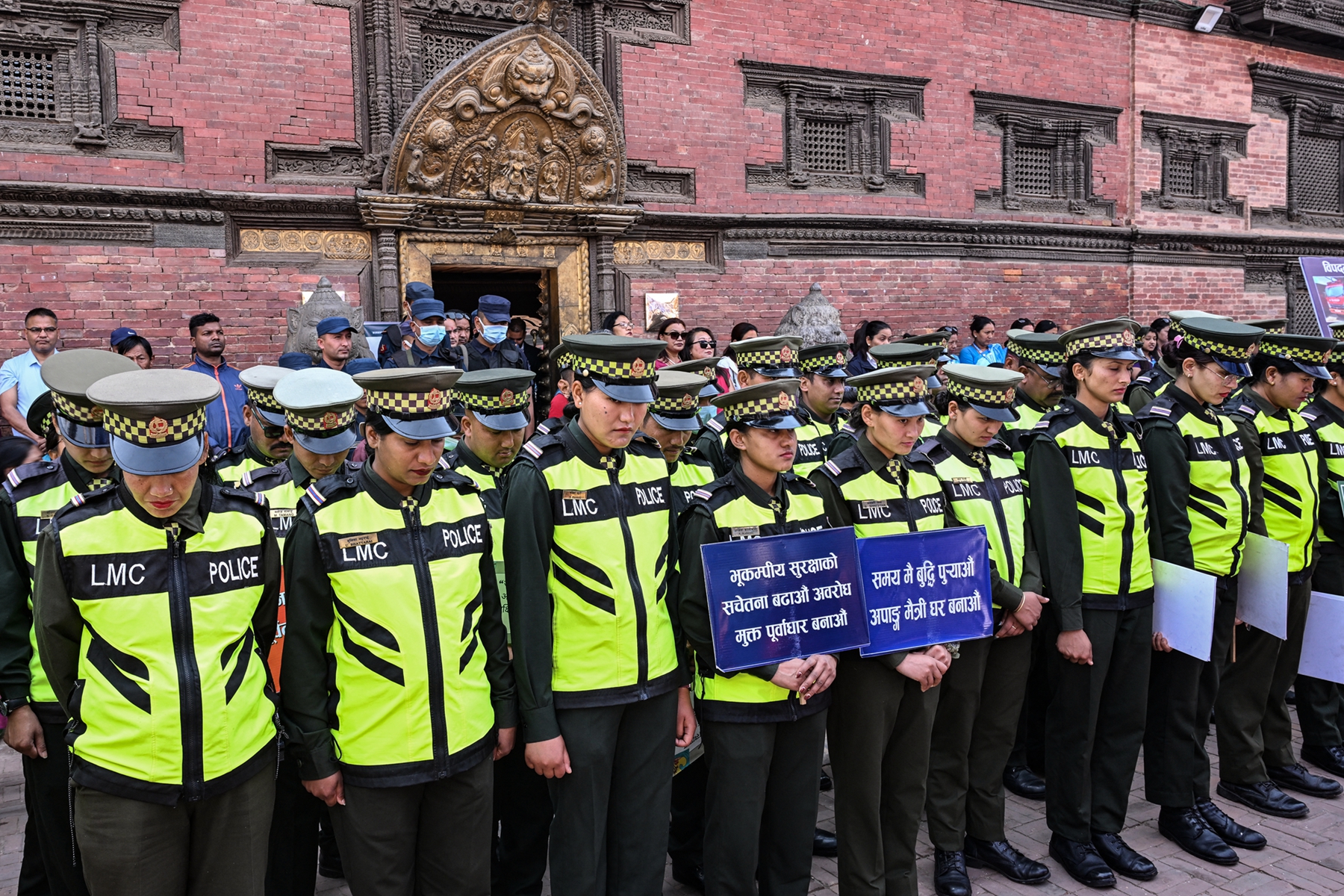 2025年4月25日,即尼泊尔“4.25”大地震十周年之际,拉利特普尔大都市 (LMC) 的警员聚集在加德满都附近的帕坦杜巴广场(Patan Durbar Square),向当年的地震遇难者致敬。(Prakash Mathema/AFP via Getty Images)