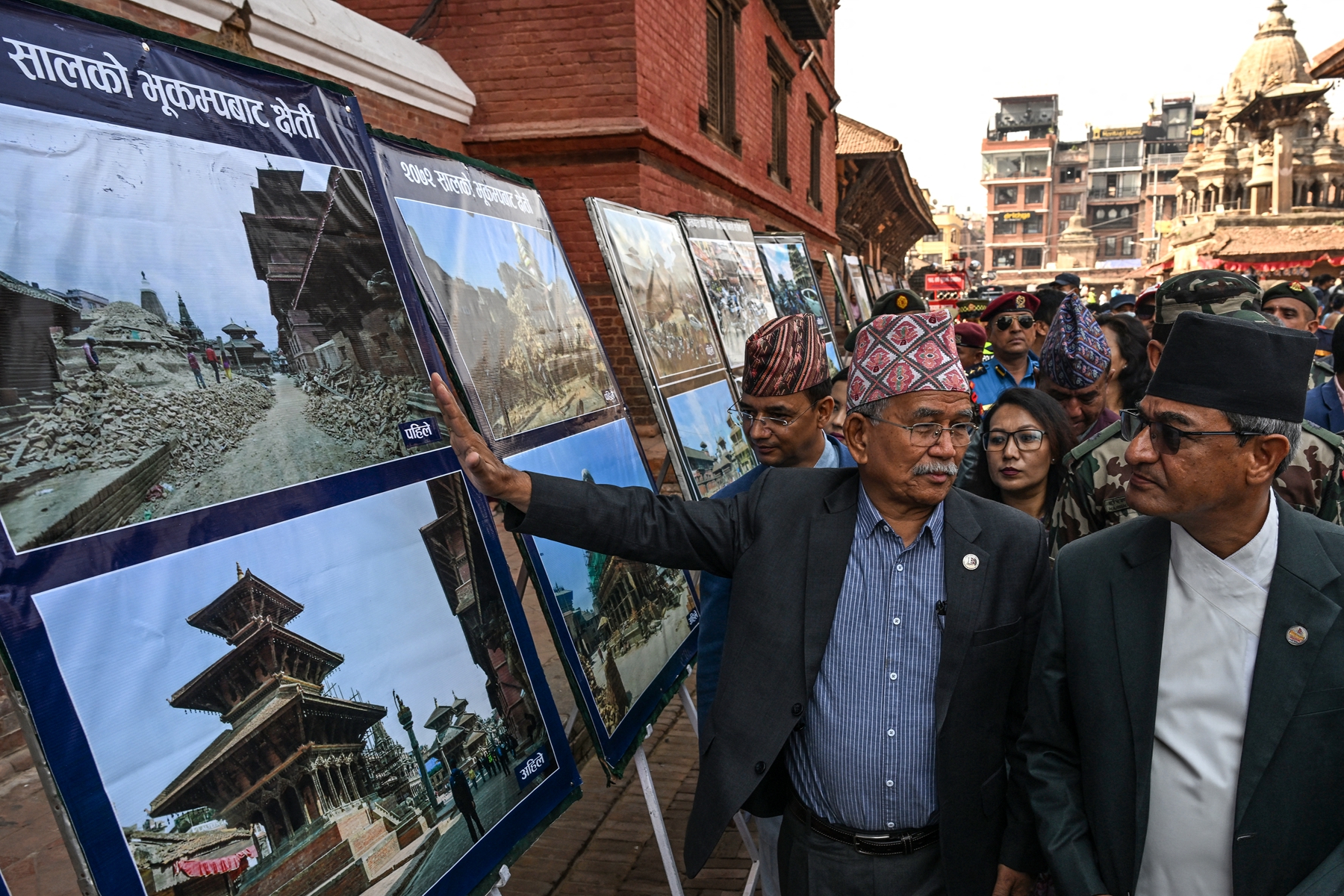 2025年4月25日,即尼泊尔“4.25”大地震十周年之际,尼泊尔内政部长拉梅什‧莱卡克(Ramesh Lekhak,右)和拉利特普尔大都市市长奇里‧巴布‧马哈尔詹(Chiri Babu Maharjan)出席在加德满都附近的帕坦杜巴广场(Patan Durbar Square)举行的纪念仪式。(Prakash Mathema/AFP via Getty Images)